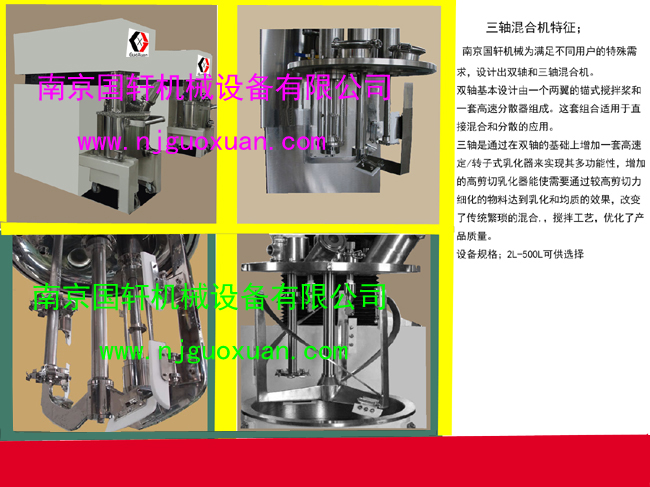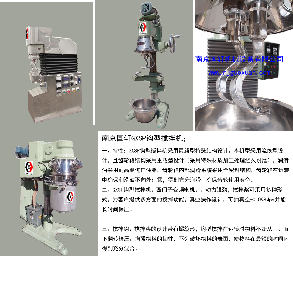 國軒機械設備有限公司位于素有六朝古都之稱:〖江蘇省省會城市南京〗公司專業從事工業攪拌機,行星分散機,雙行星混合機,三軸攪拌機,在線式混合機等設備的研發、生產、銷售為一體,產品定位于中高端,產品應用于:電池、高分子材料、焊錫膏、醫藥、化妝品、化工、膠粘劑、食品。顏料、染料和塑料等行業。公司擁有一批專業從事攪拌設備多年的優秀團隊。用現代企業的管理理念,致力于精細化管理和零缺陷作業的模式,立足于產品的質量管理......